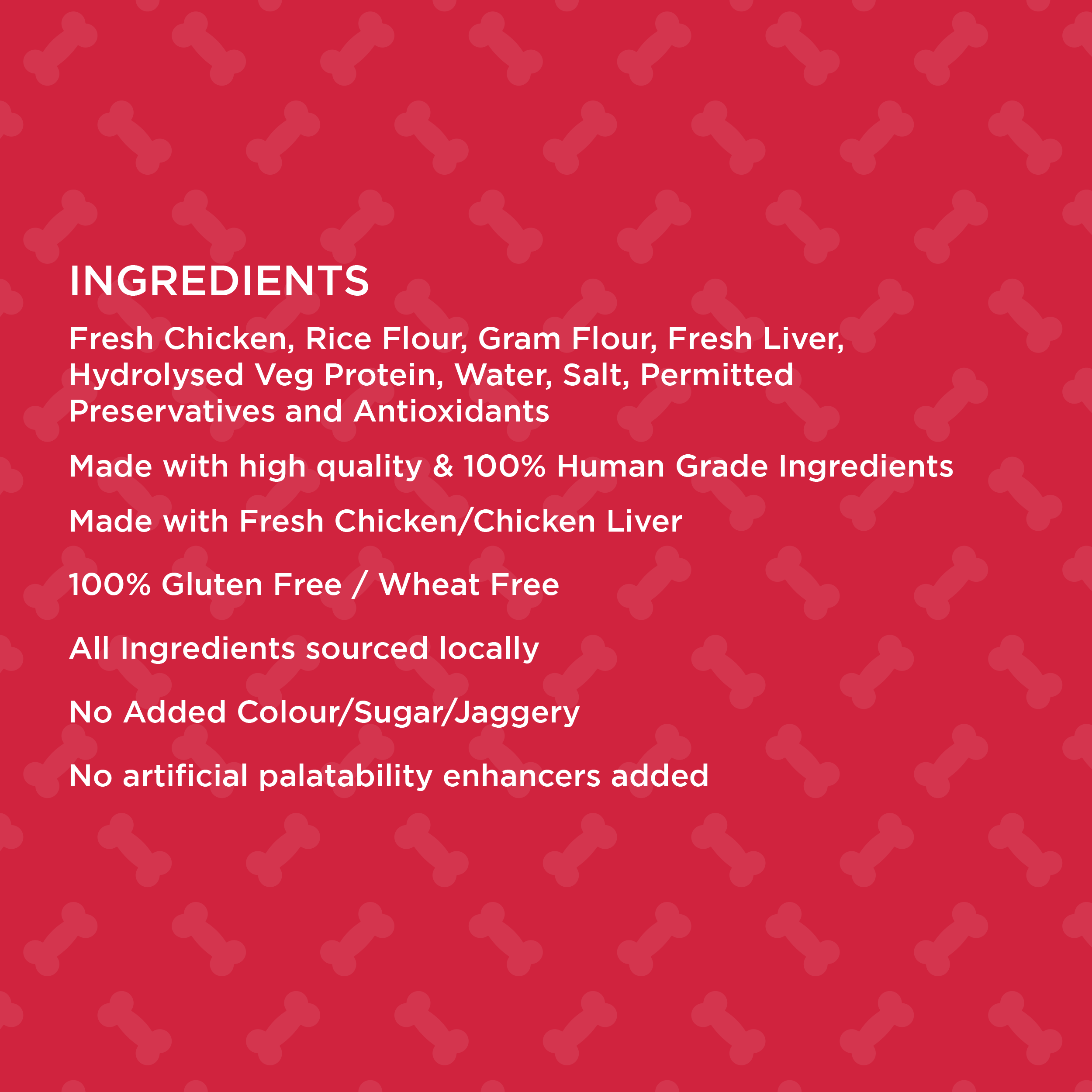 Ingredients: Fresh Chicken, Rice Flour, Gram Flour, Fresh Liver Hydrolysed Veg Protein, Water, Salt, Permitted Preservatives and Antioxidants